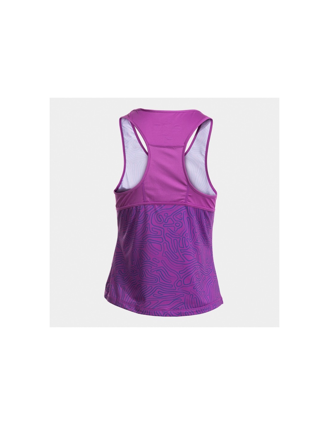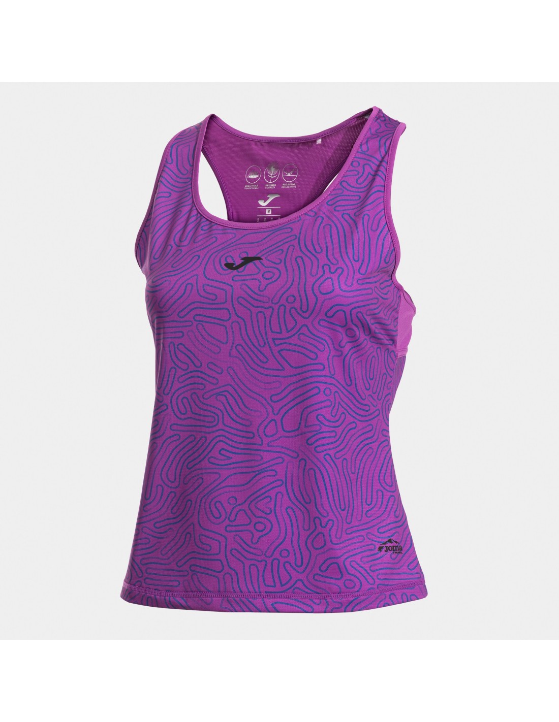 Presenta cuello redondo y espalda tipo nadadora con bolsillo en mesh. Libera los omóplatos y elimina las restricciones en los movimientos. También cuenta con acabado elástico en cuello, espalda y sisa cuyo objetivo es conseguir un ajuste cómodo. Las costuras del bajo son planas (sistema FLATLOCK), por lo que evitan las rozaduras.